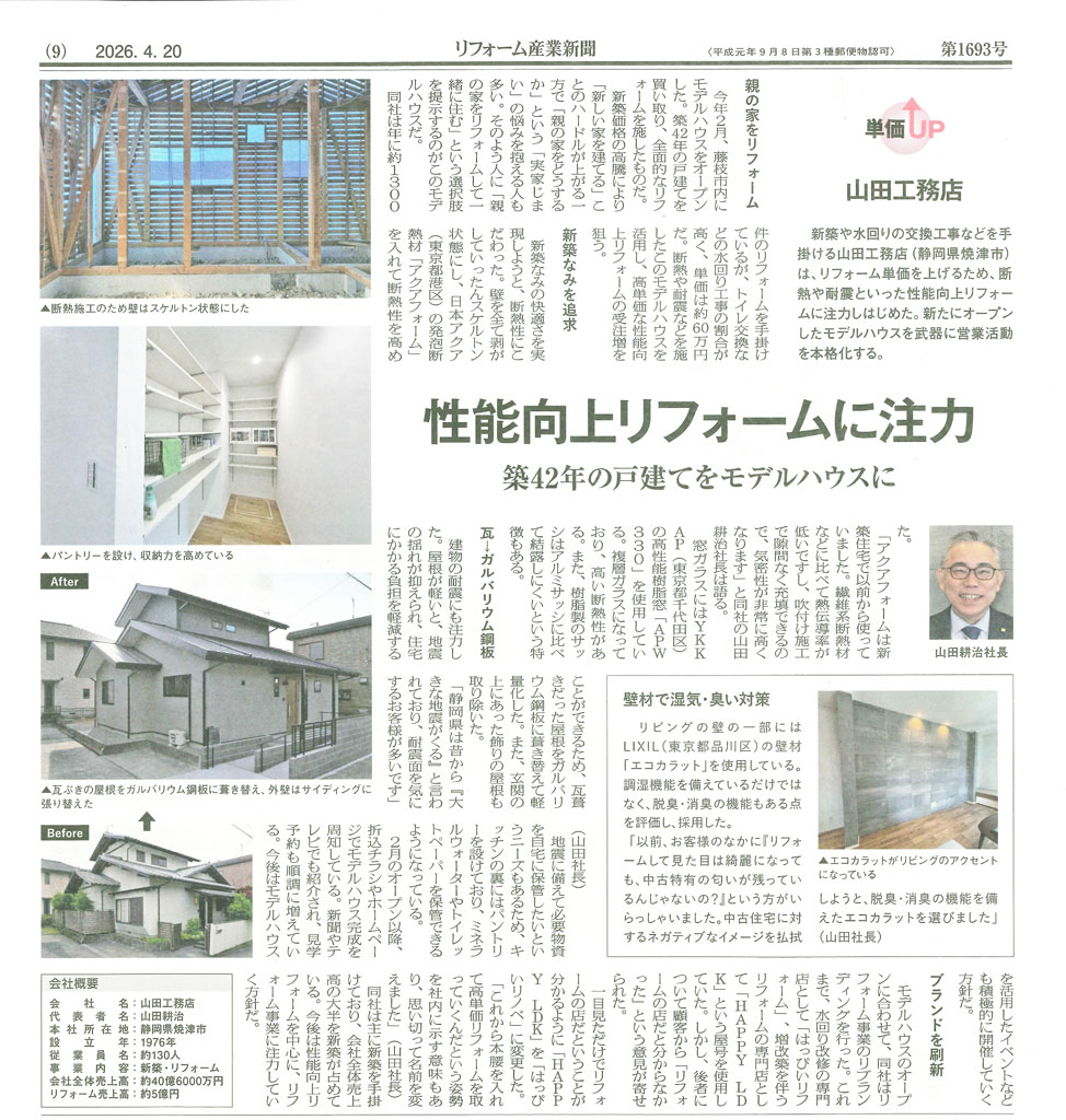 お知らせ・イベント情報 HOME お知らせ・イベント情報 【メディア掲載】性能向上リフォームに注力、築42年の戸建てをモデルハウスに 【メディア掲載】性能向上リフォームに注力、築42年の戸建てをモデルハウスに リフォーム産業新聞2026年4月20日1693号にて、はっぴいリノベの取り組みが紹介されました。https://www.reform-online.jp/news/builder/68522.php