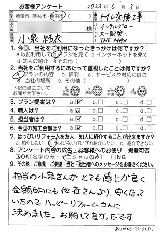 担当の小泉さんがとても感じが良く、金額的にも他社さんより安くなっていたのではっぴいリフォームさんに決めました。お願して良かったです。
